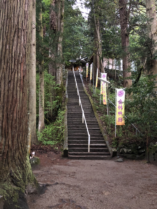 鳥居をくぐり、うっそうとした森林の中険しい階段を上ると